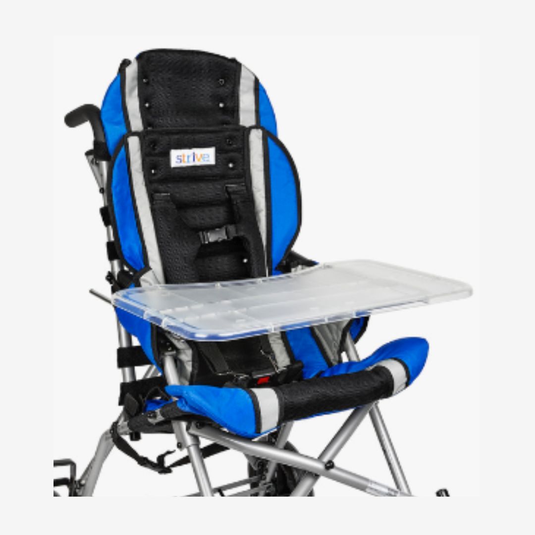 The Strive Adaptive Stroller's Upper Extremity Support Tray features a safety lip to prevent spills over the side. This tray is ideal for meals and activities. The drop-down settings provide further protection for your child.